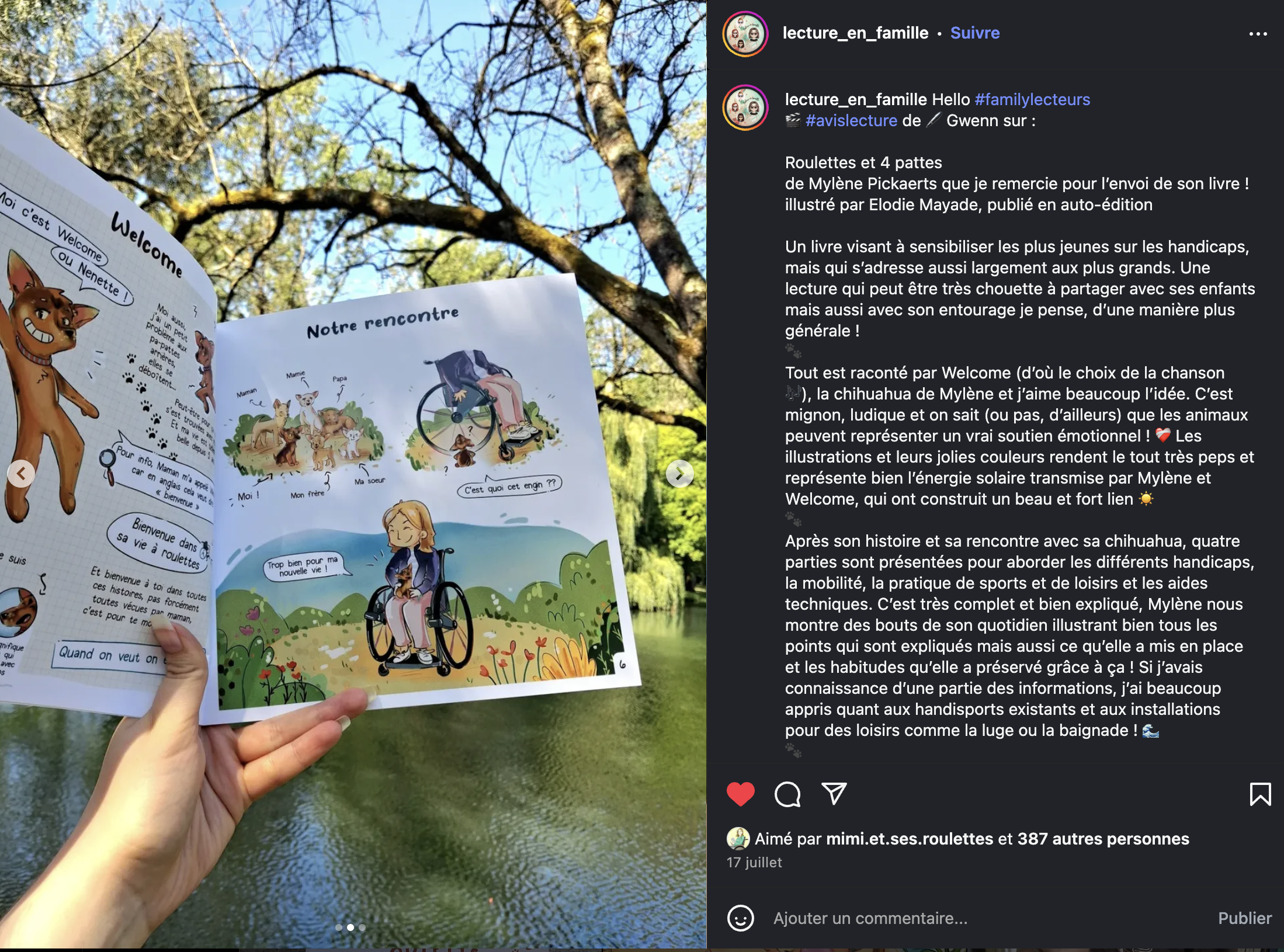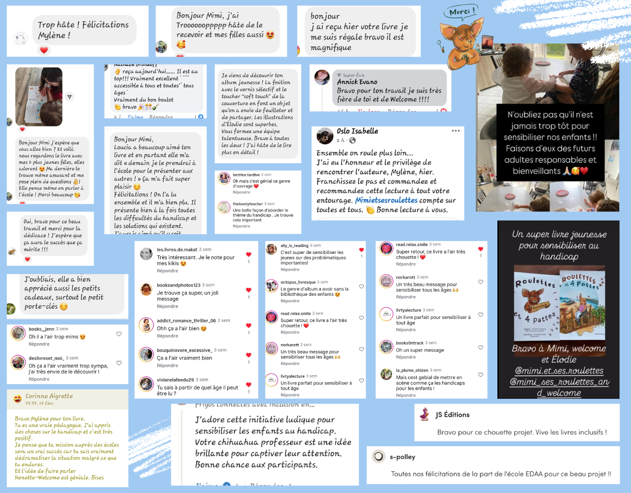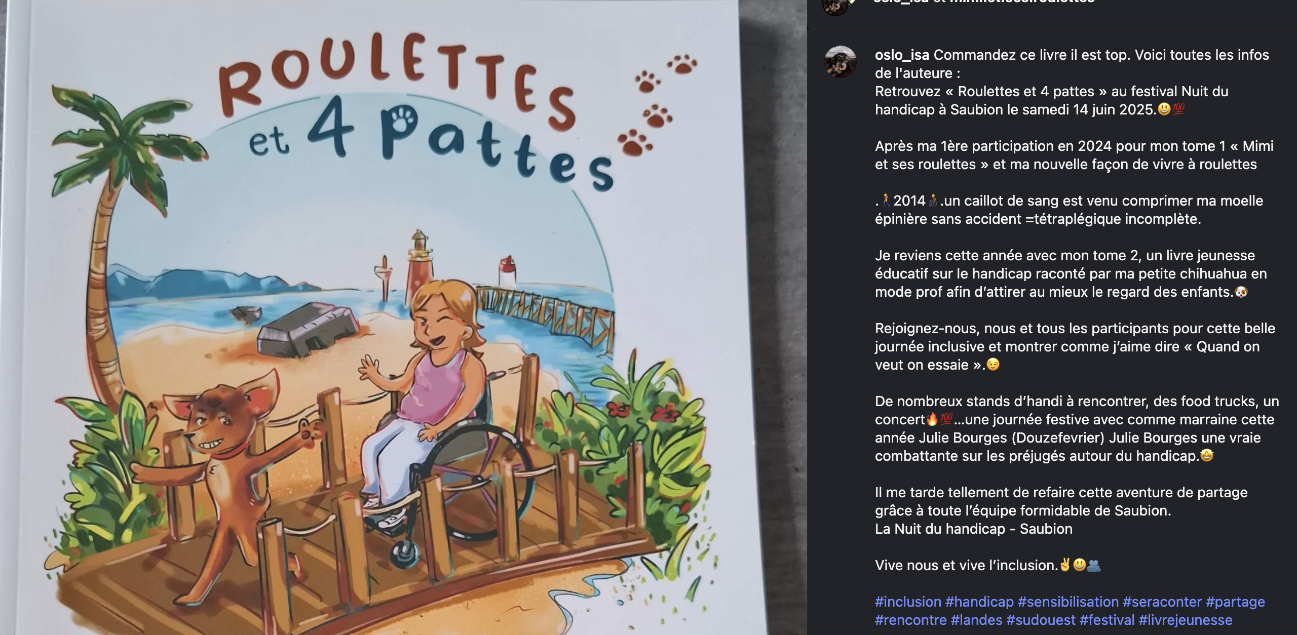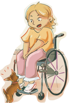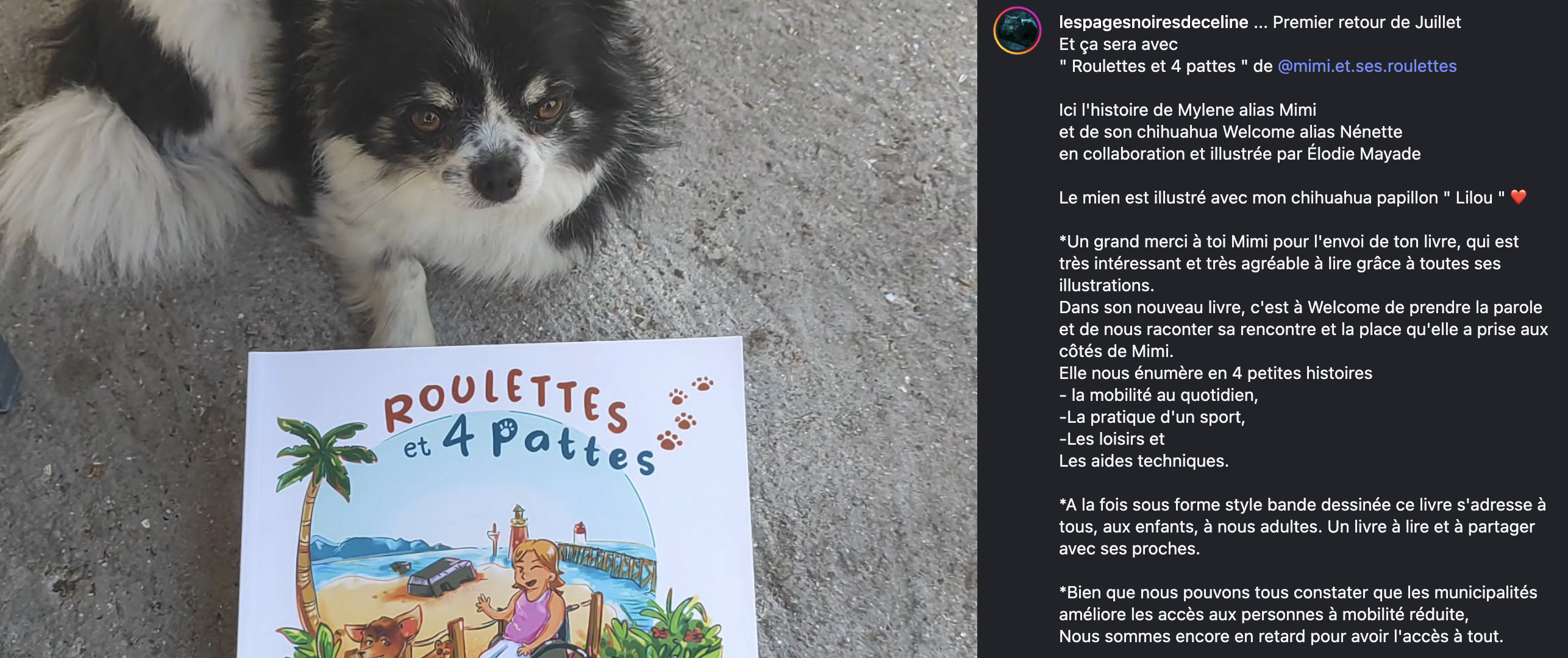 Dans ce livre, c’est une petite chihuahua rigolote et malicieuse, qui raconte la vie de sa maman, Mimi et sa vie à roulettes et le quotidien que peuvent vivre un handi' en général !